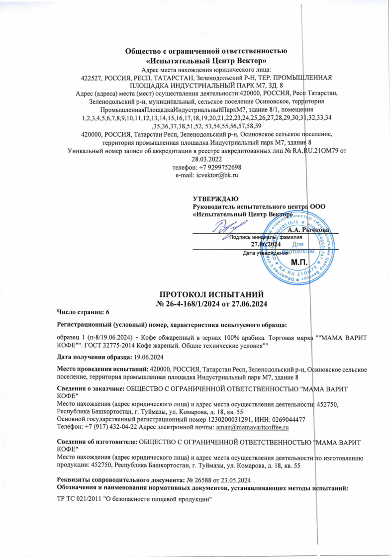 Место нахождения (адрес юридического лица) и адрес места осуществления деятельности по изготовлению продукции: 452750, Россия, Республика Башкортостан, г. Туймазы, ул. Комарова, д. 18, кв. 55 Продукция изготовлена в соответствии с ГОСТ 32775-2014 Кофе жареный. Общие технические условия". Код (коды) ТН ВЭД ЕАЭС: 0901